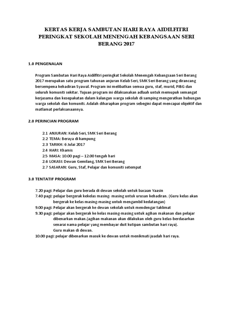 Kertas Kerja Sambutan Hari Raya Aidilfitri Peringkat Sekolah Menengah Kebangsaan Seri Berang 2017 Pdf